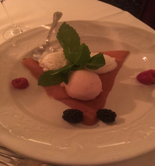 Very generous portions, very exceptional food, a very awesome Monday night experience. The dessert menu was extensive and the chef offered two sweet tastings: a chocolate biscotti and also a sorbet dessert. We truly splurged with our dolce course. I had a caramel gelato with honey glazed crisps and Vince ordered 3 flavors of gelato. Centanni wishes from chef Michael Cetrulo and the wait staff, even though my birthday was two months ago and well celebrated.