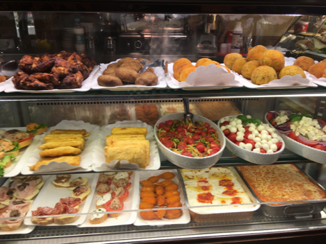An osteria display of foods: arancini, lasagna, calzones, prosciutto, fried prawns. Also, grilled vegetables, mozzarella caprese, frutta di mare, sardines, octopus. All very fresh and wonderful.